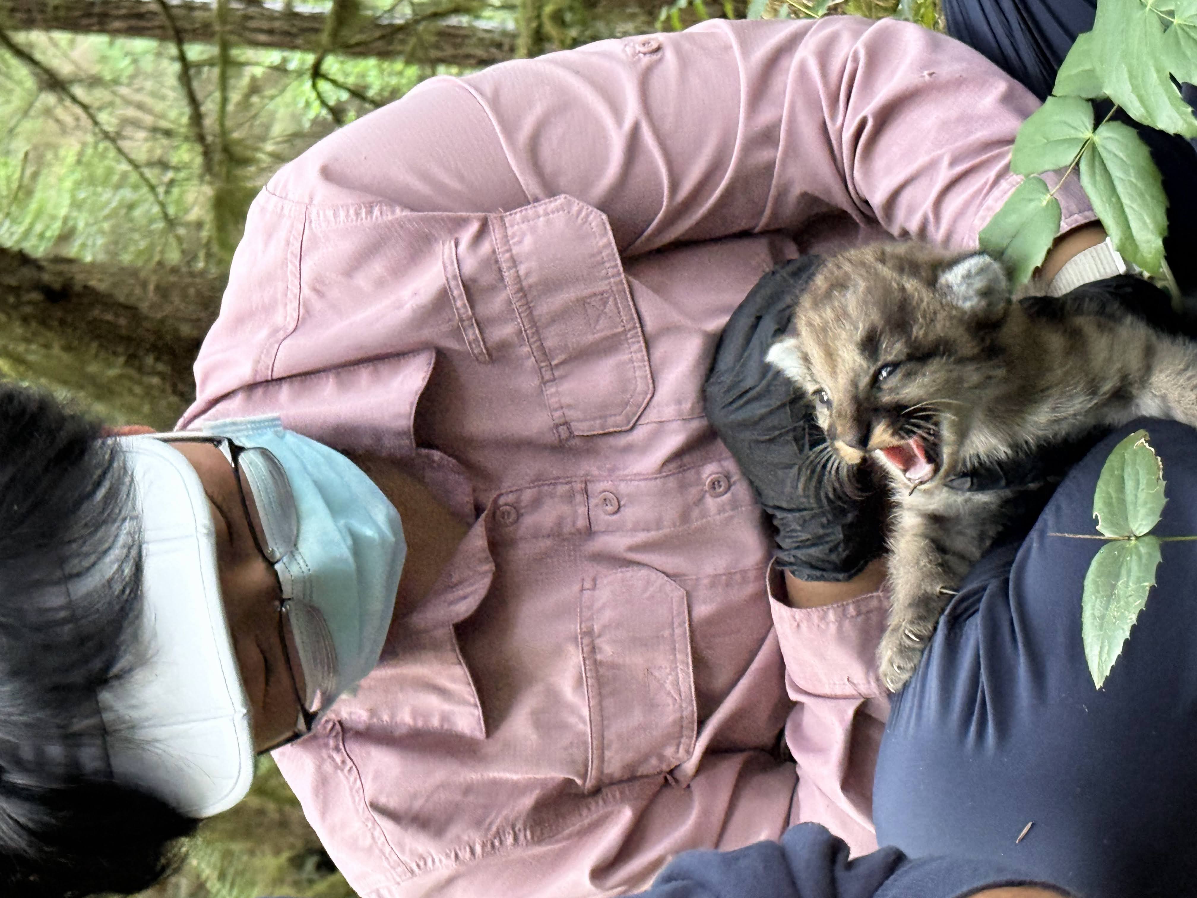 Jiangyue visiting cougar denning site and holding a kitten! Photo courtesy of Mark Elbroch